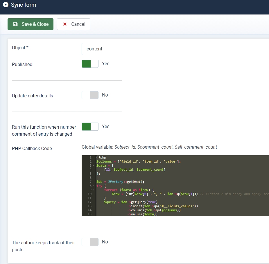 <?php $columns = ['field_id', 'item_id', 'value'];// $data = [12, $object_id, $comment_count];$data = [12, 42, 4];$query = $db->getQuery(true) ->insert($db->qn('#__fields_values')) ->columns($db->qn($columns)) ->values($data);//$db->setQuery(substr_replace($query, 'REPLACE ', 0, 8)); // swap INSERT for REPLACE$db->setQuery($query);$db->execute();?>