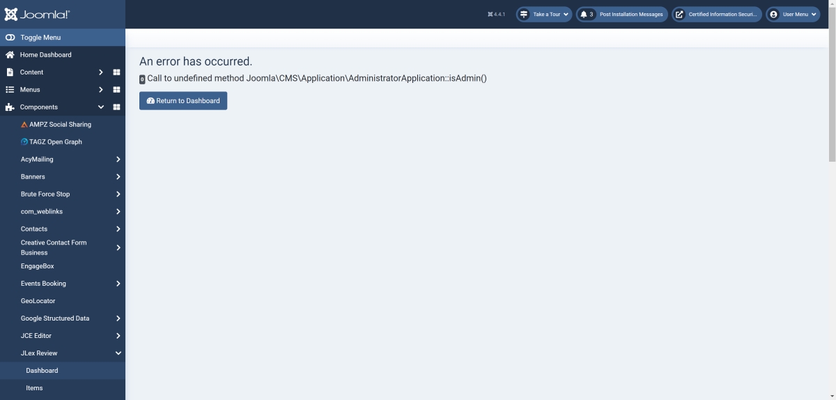 I'm runnig Jlex Review 6.0.1 on J 3.10.12. I am in the process of troupbleshooting upgrading J3.x to J 4.4.1. Updating crashes, so I had to disable almost all plugins, update, and then painstakingly go through re-enabling one at a time. Re-enabling "System - Jlex Review" results in "Call to undefined method Joomla\CMS\Application\AdministratorApplication::isAdmin()", which is the same error I get when attempting to update without disabling almost all plugins first. It seems this JLex Review plugin is my upgrade blocker.