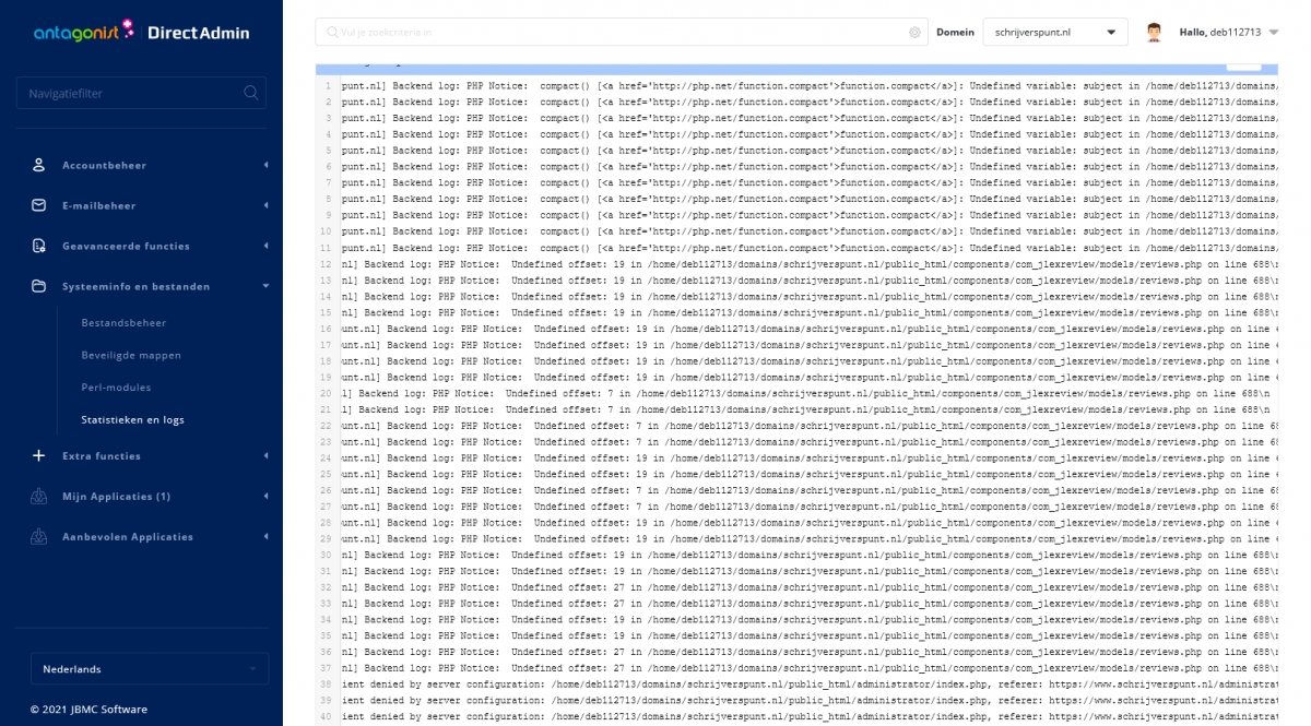 One error is: [Tue Aug 10 22:16:21.319400 2021] [lsapi:warn] [pid 1746833:tid 139724857427712] [client 54.36.148.237:49834] [host schrijverspunt.nl] Backend log: PHP Notice: Undefined offset: 19 in /home/deb112713/domains/schrijverspunt.nl/public_html/components/com_jlexreview/models/reviews.php on line 688\n