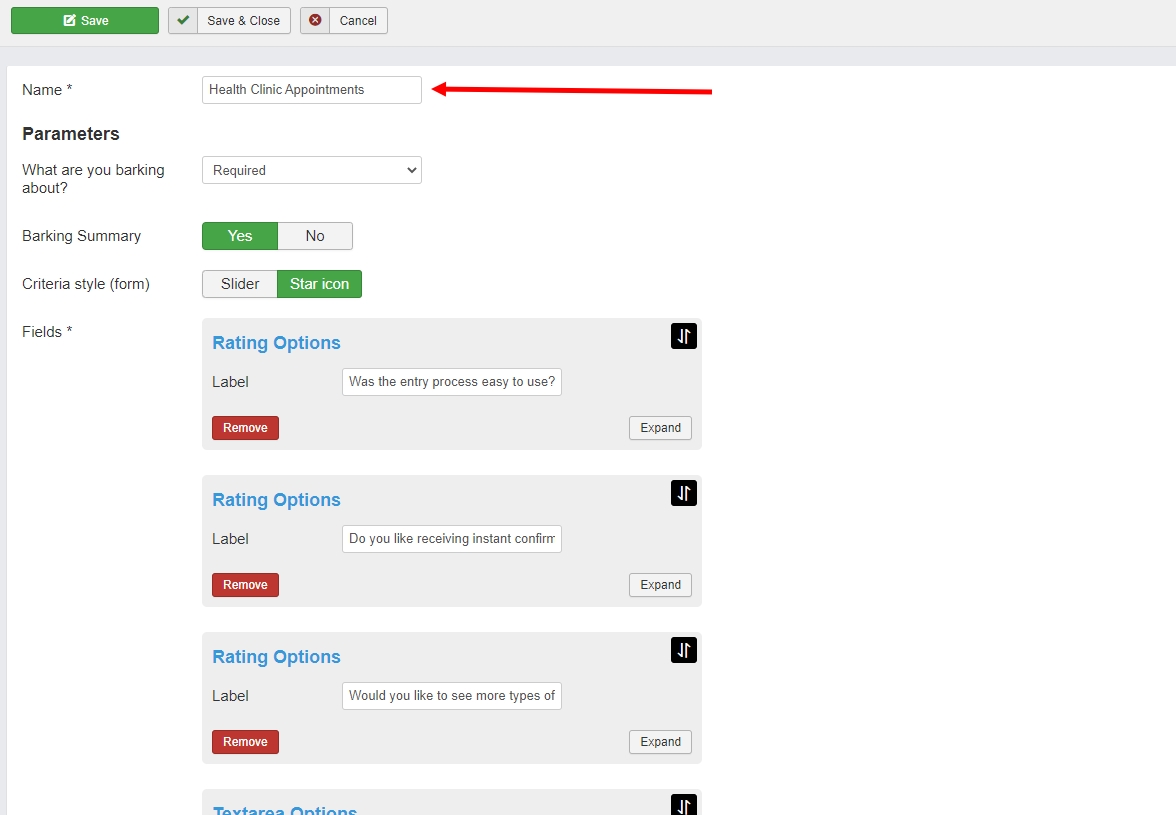 I am trying to create a review and then embed it in an article. I created a menu item at https://topdogwebdesigns.com/index.php/reviews/see-reviews-of-our-products/health-clinic-appointments but the items for the review do not appear.