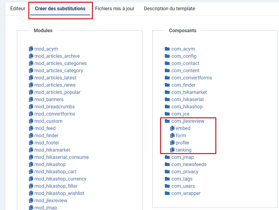 When I want to create a substitution for the reviews folder, form, or something else, the folder is empty. I tried to manually create the substitution but it doesn't work: /templates/myTemplateName/html/com_jlexreview/reviews/default_summary.php for example, by replacing myTem... with the theme name.